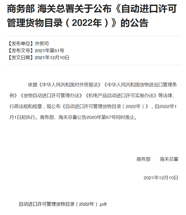 自動進(jìn)口許可管理貨物目錄由商務(wù)部會同海關(guān)總署等有關(guān)部門制定、調(diào)整和公布。