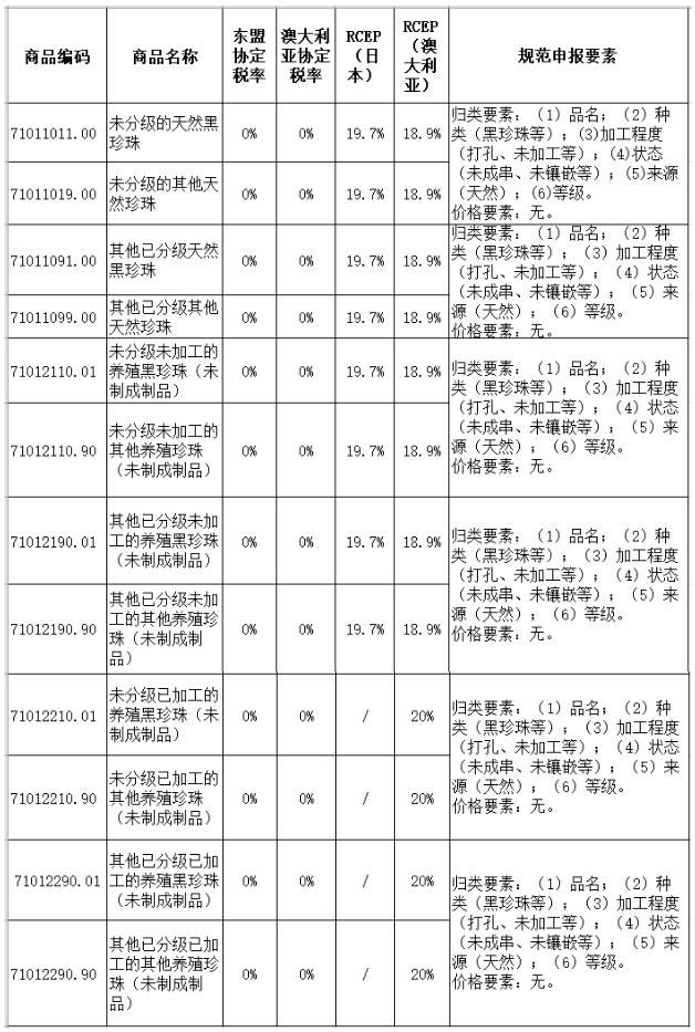 整顆珍珠應歸入7101項下,再根據珍珠種類、天然或養殖等進行詳細歸類。其中,黑珍珠因為比較稀有,價格較為昂貴,在《中華人民共和國進出口稅則》中單獨列名。從部分國家和地區進口是可以享受優惠關稅的,下面介紹珍珠可能涉及的歸類、規范申報要素及進口關稅稅率: